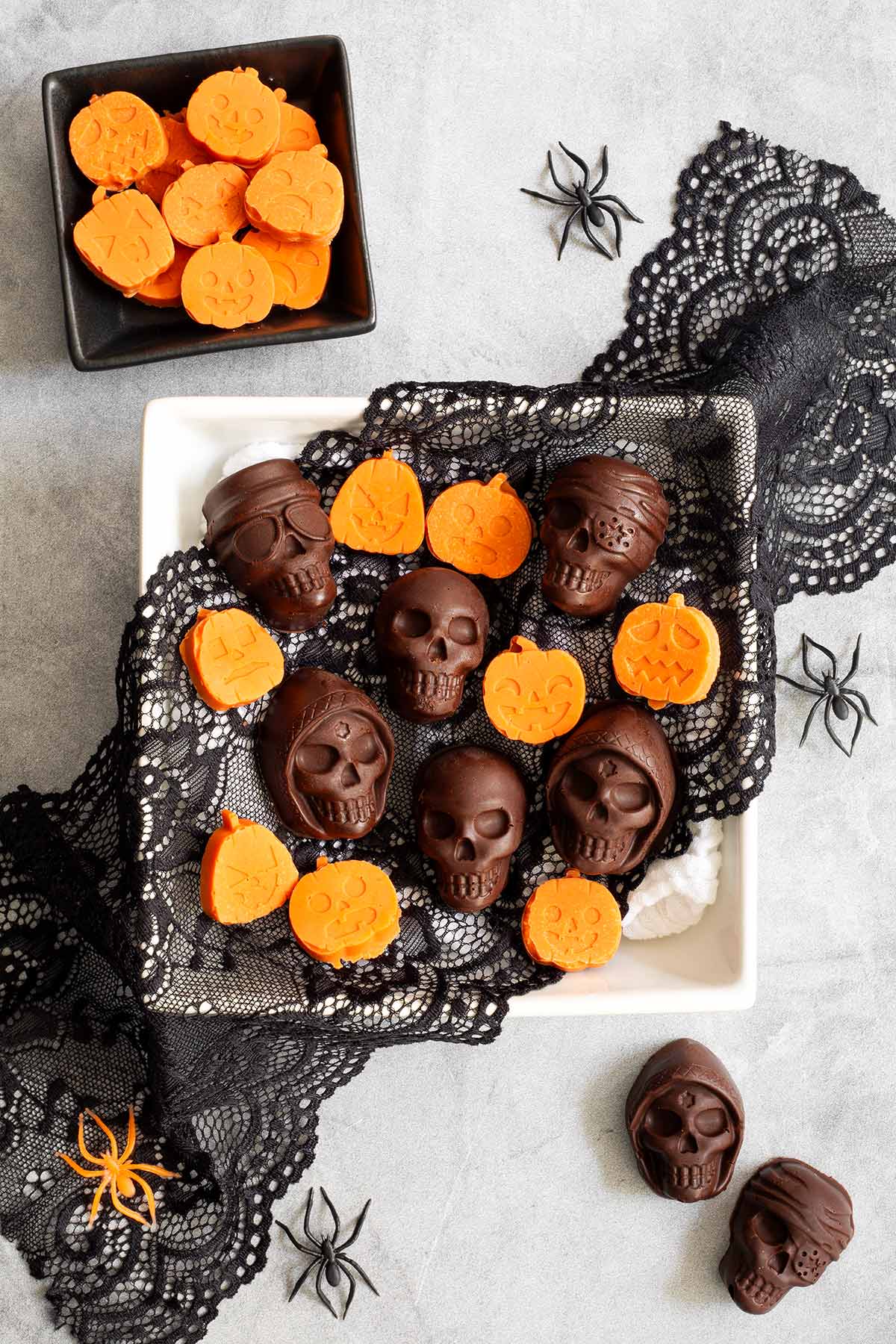 - Pop the chocolates out of the silicone molds. If desired, drizzle with extra melted chocolate, sprinkle with sea salt, or add allergen-free Halloween sprinkles.