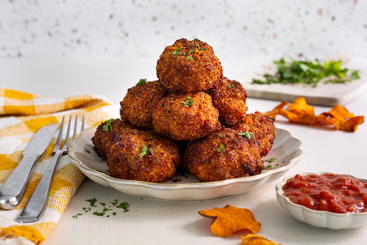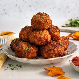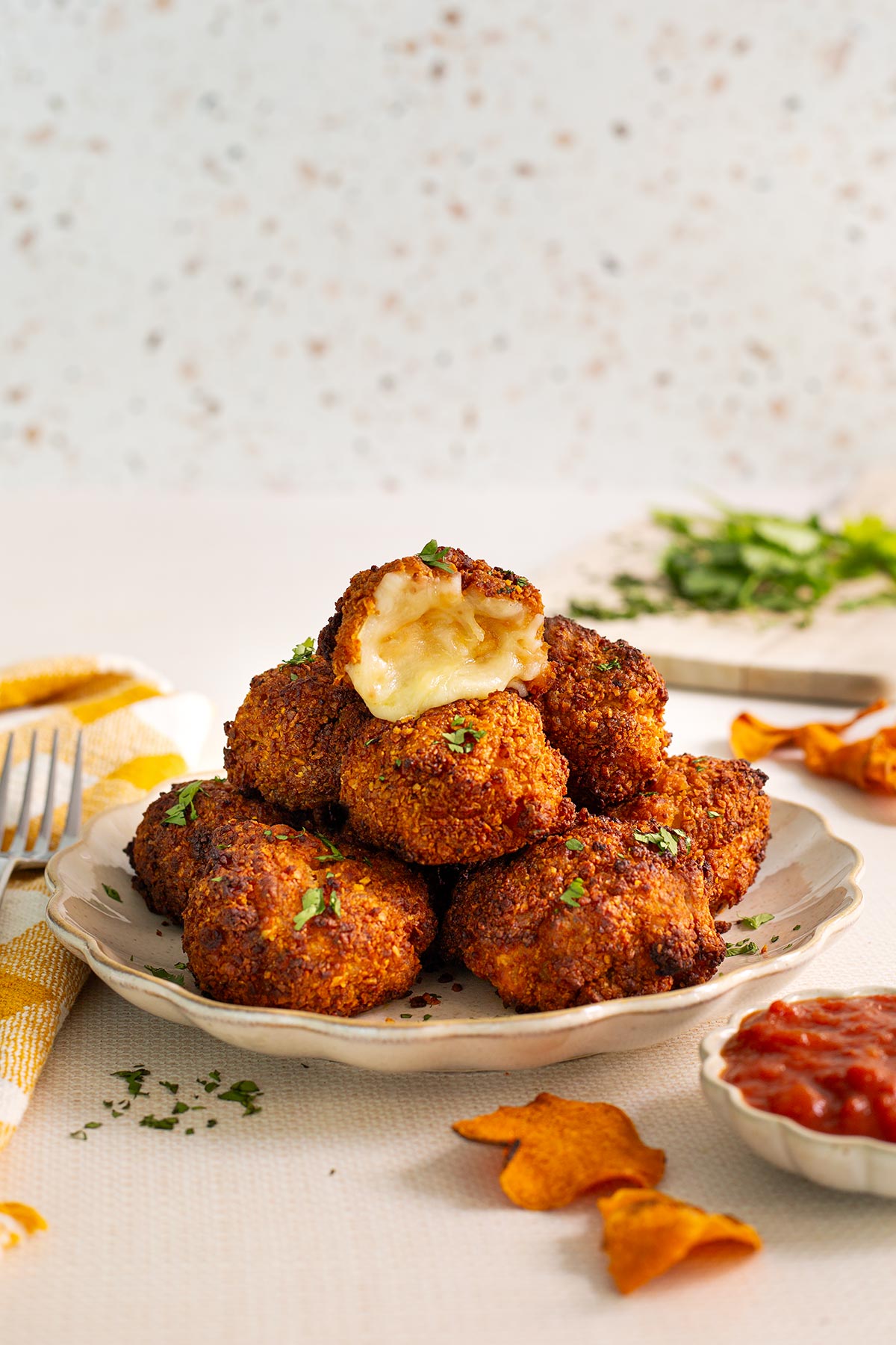 First off, let’s talk crunch. Instead of traditional breadcrumbs, this recipe uses Jackson’s Sea Salt Sweet Potato Chips – and wow, do they take these bites to the next level. The chips add a naturally sweet flavor that balances the cheesy richness, plus they create the most satisfying crunch when air-fried. You’ll definitely find yourself reaching for seconds (and thirds).