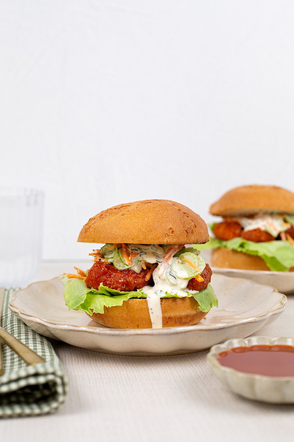 We love gluten-free sandwiches of all kinds here. When it comes to easy, flavor-packed meals, these Gluten-Free Buffalo Chicken Sandwiches are a total game changer. Made with Pork King Good Chicken Puggets, this recipe turns your favorite spicy appetizer into a quick and satisfying sandwich — without any gluten, soy, or fuss.