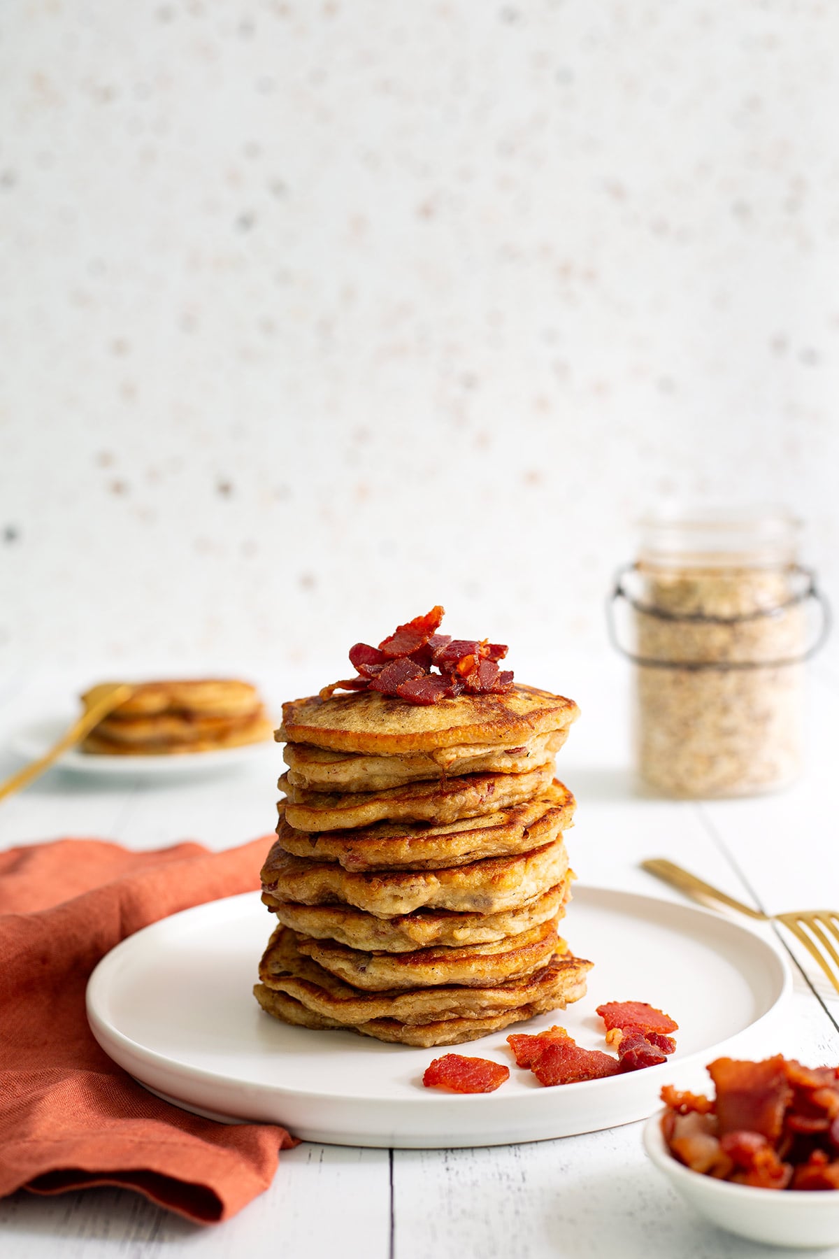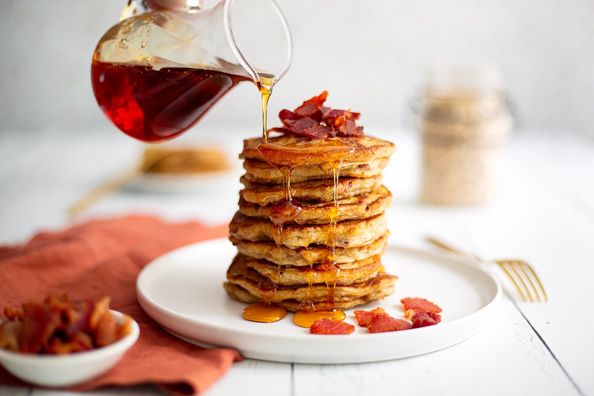 These pancakes are already packed with flavor, but you can absolutely take them over the top. Add extra crispy bacon on top, drizzle generously with warm maple syrup, or even add a pat of dairy-free butter.
