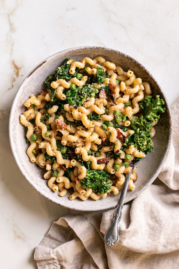- Cover peas with water in a microwavable bowl. Microwave for 2 minutes. Drain. Add to the pasta mixture and toss. Add the kale leaves and vegan Parmesan cheese. Toss one final time. Top with toasted almonds and more vegan Parmesan cheese, if desired. Serve.