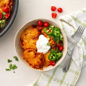 Instead of tortillas, this recipe uses gluten-free cheese tortellini, which soak up the enchilada sauce beautifully and add an extra layer of comfort. Once topped with shredded cheese and gently melted, the dish becomes creamy, bubbly, and irresistibly cozy, like a cross between enchiladas and a pasta bake, but faster and easier.