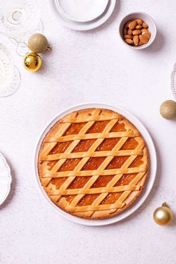 • Retrieve the remaining dough portion from the refrigerator. Roll it out to a thickness of about ½-inch and cut it into strips. Create a lattice pattern on top of the pie by arranging the strips in a crisscross fashion, gently pressing the edges to adhere. Brush the edges of the lattice with the whisked egg white and place the pie in the preheated oven. Bake the pie for 15 minutes, then reduce the temperature to 350° F and continue baking for an additional 45-50 minutes, or until the filling sets and the top is golden. If the pie begins to brown too much, cover it with a piece of foil. Allow the pie to cool, then refrigerate overnight or until ready to serve.