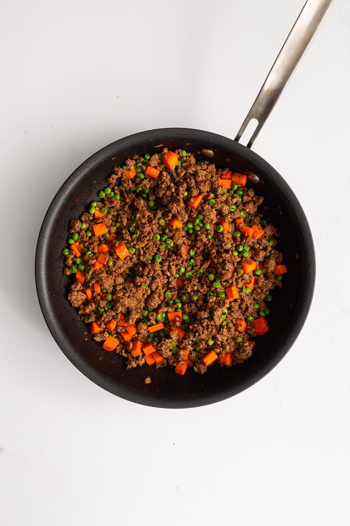 - In a large skillet, heat the olive oil over medium-high heat. Add the onion and cook for 5 minutes or until translucent. Add the garlic and Italian seasoning and cook for another 30 seconds. Add the ground beef, season with salt and pepper, and cook, breaking it up, until no longer pink, 7-8 minutes. Drain off any excess fat. Add the tomato paste and cook for another 1-2 minutes. Stir in the carrots and beef broth and simmer for 2-4 minutes or until the beef is fully cooked and the liquid reduces. Stir in the peas and cook for another 1 -2 minutes. Taste and adjust with more salt and pepper if needed. Transfer to the prepared baking dish and spread the mashed sweet potatoes over the top evenly.