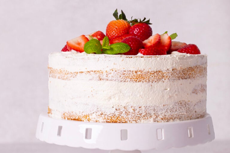 The strawberry layered cake on a stand.