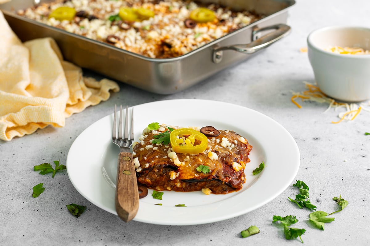 - Eggplant: Thinly sliced and roasted until soft and flexible, replacing traditional tortillas.