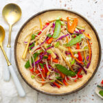 In a large bowl, combine the cooled noodles, corn, cabbage, carrots, bell peppers, cucumber, snap peas, green onions, and Fresno chili.