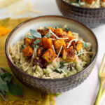 Spoon orzo into bowls, top with roasted butternut squash cubes, extra sage leaves or garnish, and more Parmesan if desired. Serve immediately.