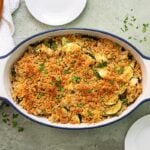 In a small bowl, combine the cookie crumbs, melted dairy-free butter, and nutritional yeast. Sprinkle evenly over the casserole. Bake for 20 – 25 minutes or until heated through, and the topping is golden and crispy. Let it sit for 5 minutes before serving. Garnish with parsley if desired.