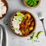 Spoon the seasoned rice into bowls and top with the shrimp vindaloo. Garnish with fresh cilantro and serve with lime wedges for a bright finishing touch.
